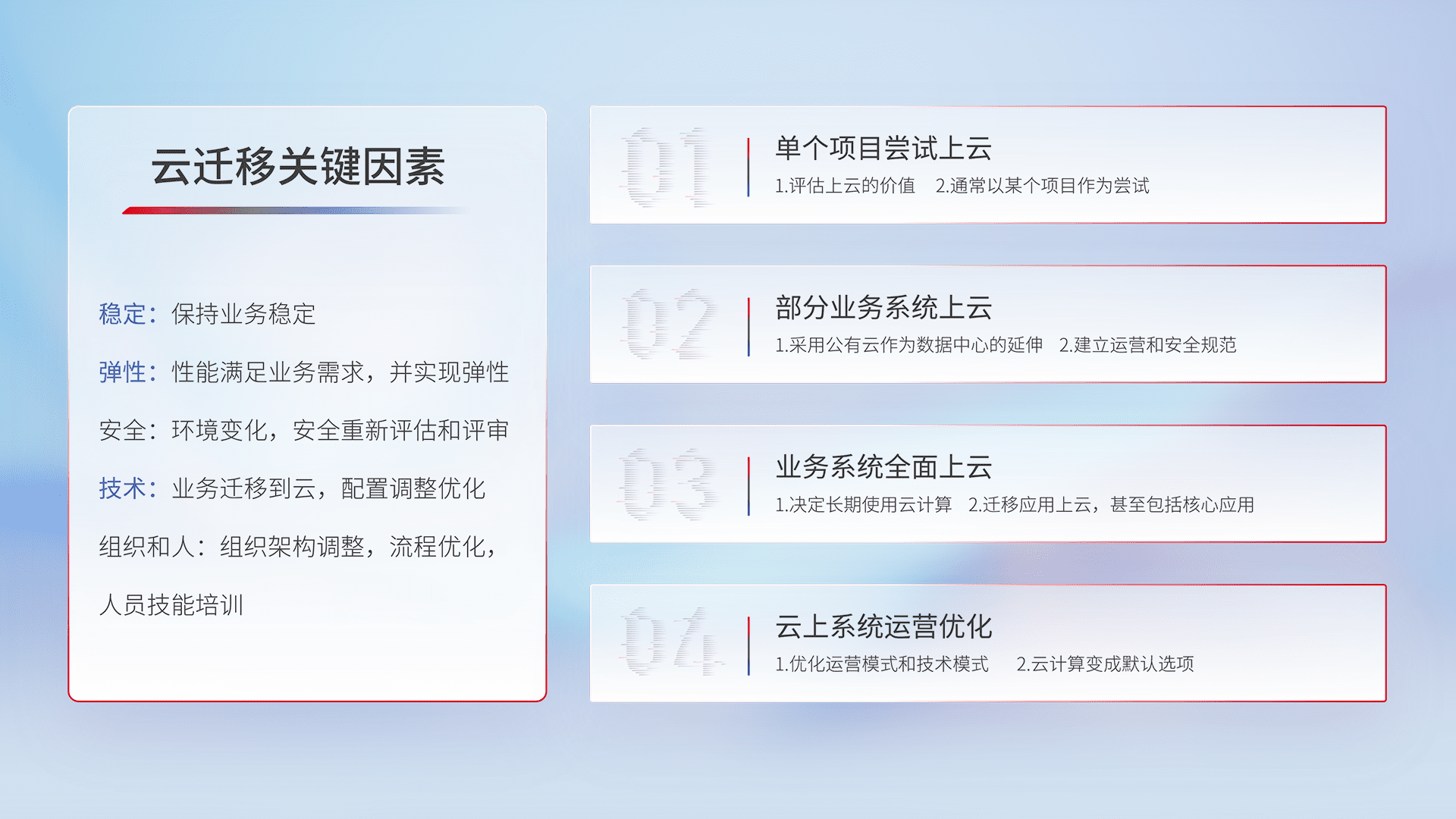 结合实际业务,,,,从规划设计、、云平台选型、、、云原生改造、、、数据迁移、、、、集成交付,,迁移全过程为客户识别最佳上云路径,,,做好风险识别管理,,,设计网络架构、、身份权限、、安全审计合规、、、操作审计、、、、日志审计、、、监控告警策略、、、、多站点容灾设计等,,,对云上基础设施进行整体规划,,提升IT治理水平,,,,以满足弹性、、高可用、、、高性能的需求。。。。